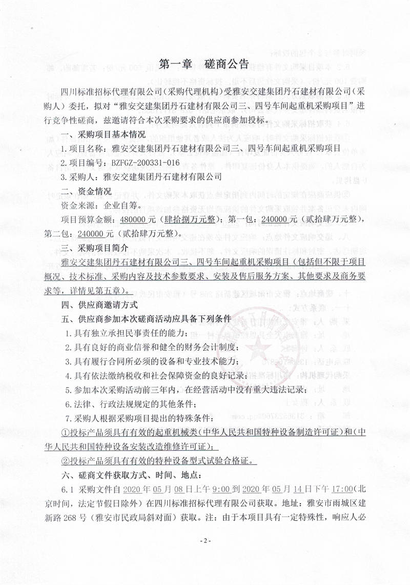 雅安交建集團(tuán)丹石建材有限公司三、四號(hào)車間起重機(jī)采購項(xiàng)目競(jìng)爭性磋商公告