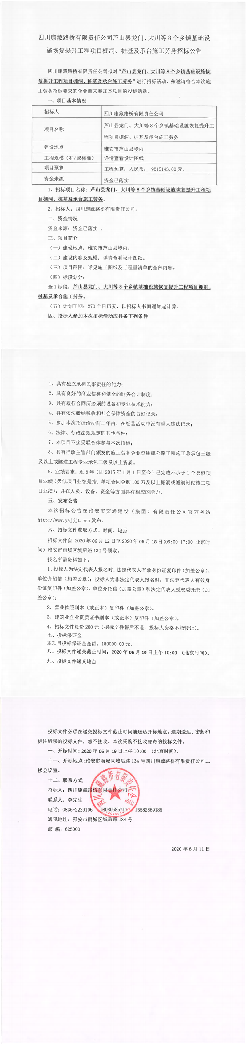 四川康藏路橋有限責(zé)任公司蘆山縣龍門、大川等8個鄉(xiāng)鎮(zhèn)基礎(chǔ)設(shè)施恢復(fù)提升工程項(xiàng)目棚洞、樁基及承臺施工勞務(wù)招標(biāo)公告