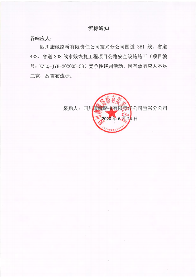 四川康藏路橋有限責(zé)任公司寶興分公司國(guó)道351線、省道432線、省道308線水毀修復(fù)工程項(xiàng)目公路安全設(shè)施施工流標(biāo)通知
