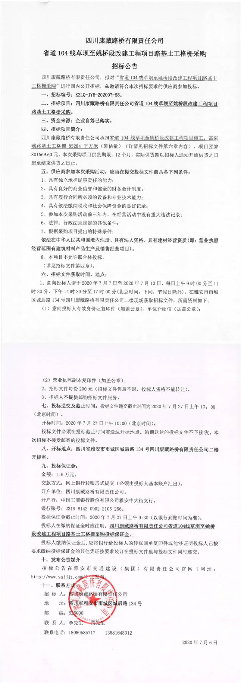 四川康藏路橋有限責(zé)任公司省道104線草壩至姚橋段改建工程項目路基土工格柵采購招標(biāo)公告