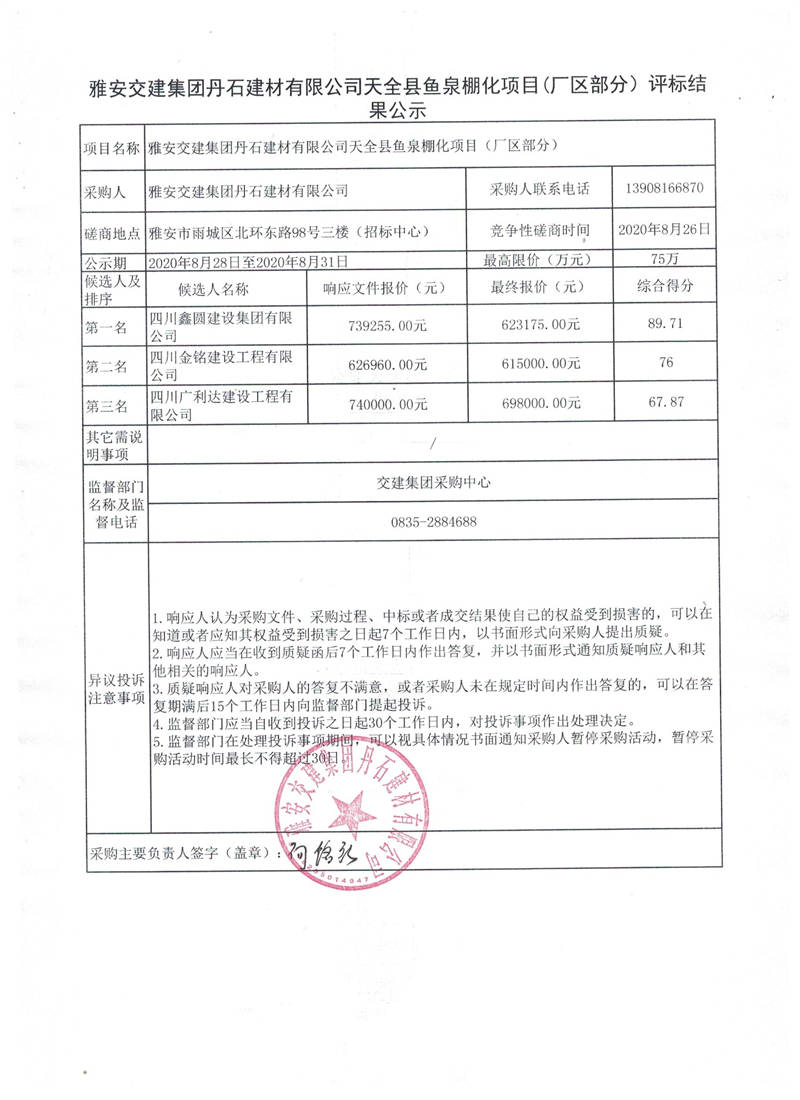 雅安交建集團丹石建材有限公司天全縣魚泉棚化項目(廠區(qū)部分)評標結果公示
