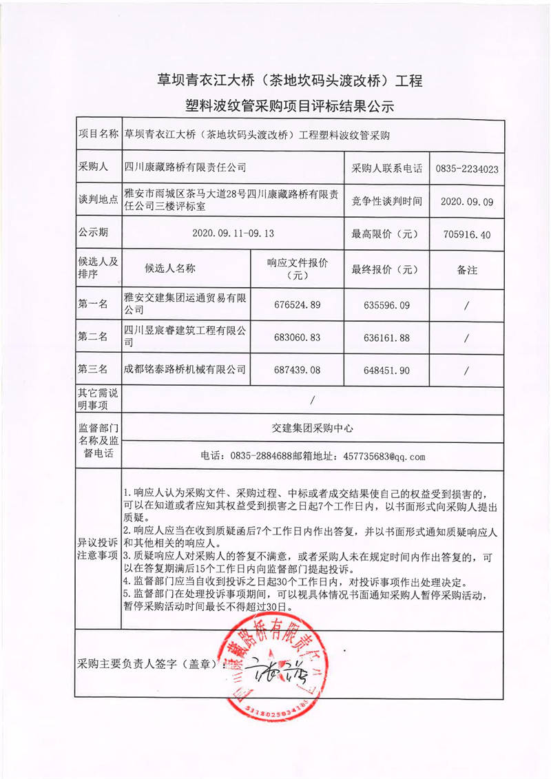 四川康藏路橋有限責(zé)任公司草壩青衣江大橋(茶地坎碼頭渡改橋)工程塑料波紋管采購項(xiàng)目評標(biāo)結(jié)果公示