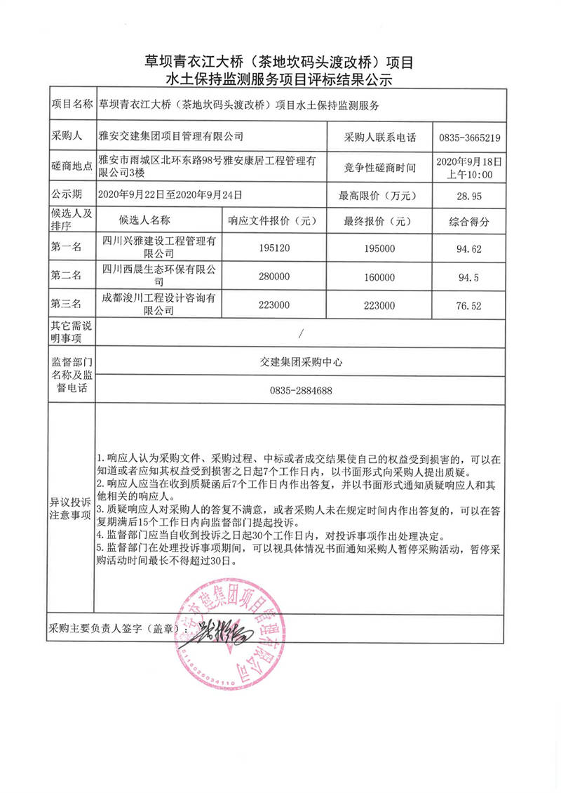 雅安交建集團(tuán)項(xiàng)目管理有限公司草壩青衣江大橋(茶地坎碼頭渡改橋)項(xiàng)目水土保持監(jiān)測服務(wù)項(xiàng)目評標(biāo)結(jié)果公示