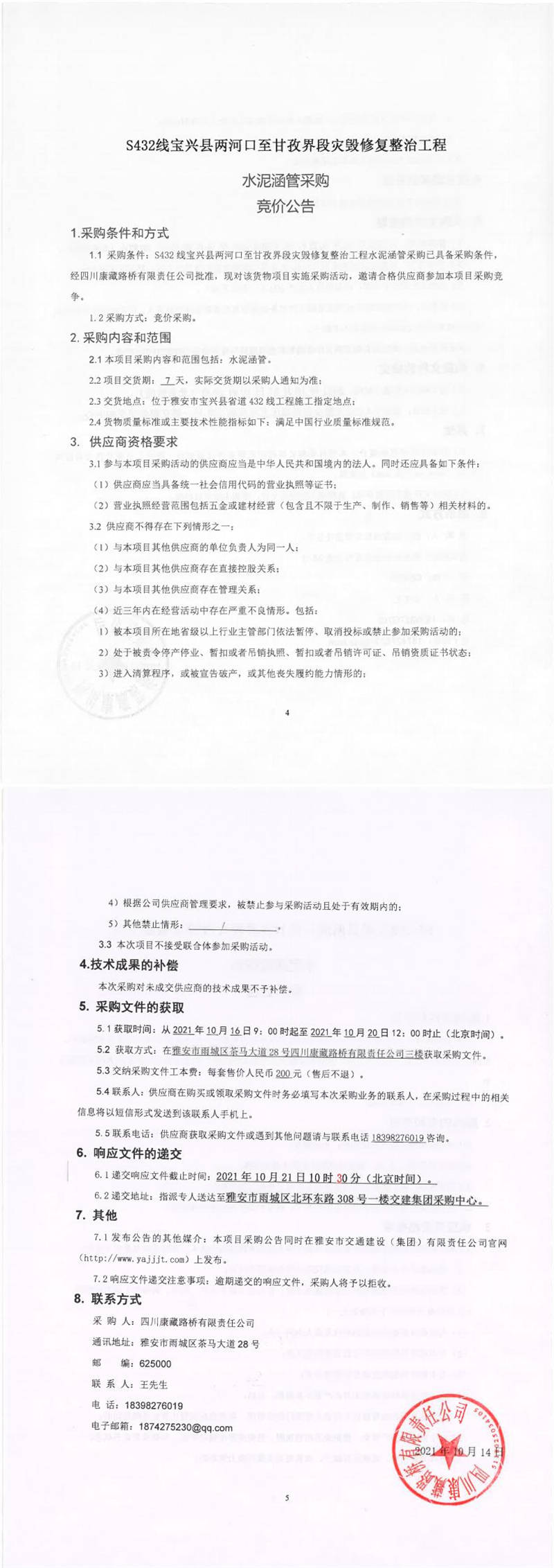 四川康藏路橋有限責(zé)任公司S432線寶興縣兩河口至甘孜界段災(zāi)毀修復(fù)整治工程水泥涵管采購競價公告