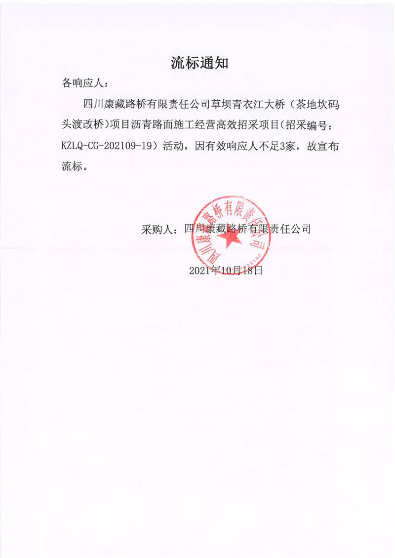 四川康藏路橋有限責(zé)任公司草壩青衣江大橋(茶地坎碼頭渡改橋)項(xiàng)目瀝青路面施工經(jīng)營高效招采項(xiàng)目流標(biāo)通知