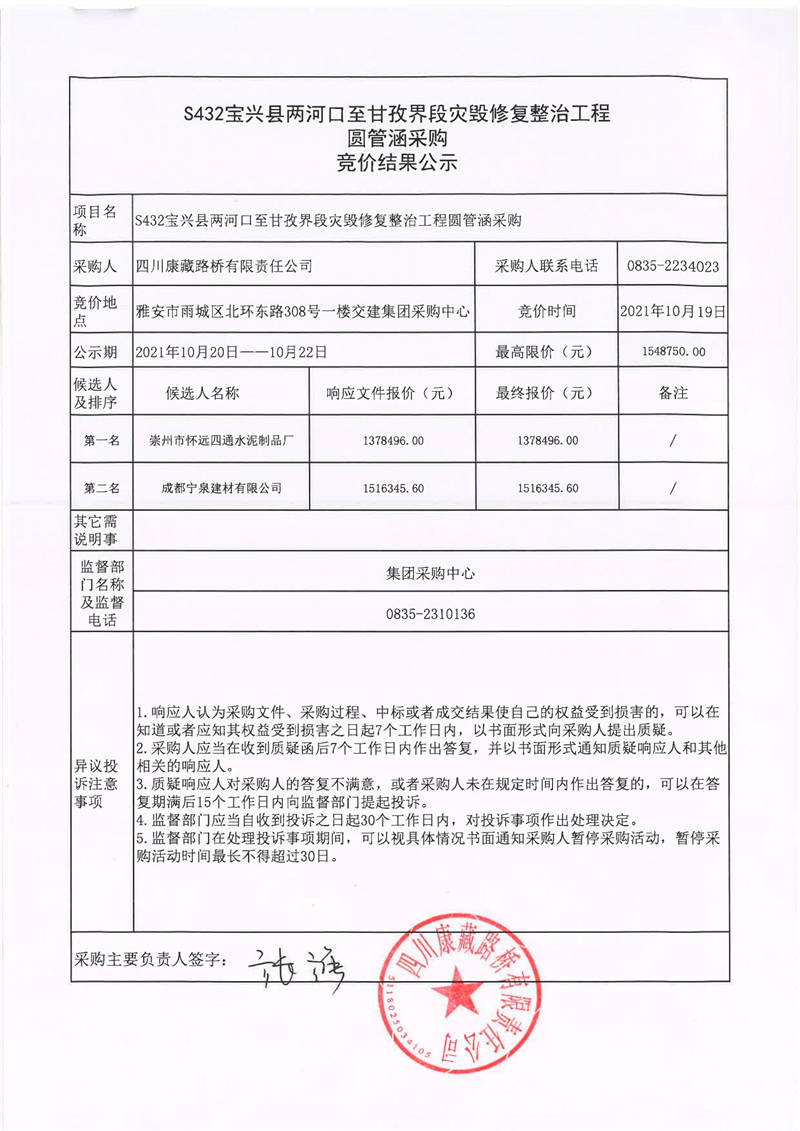 四川康藏路橋有限責任公司S432線寶興縣兩河口至甘孜界段災毀修復整治工程圓管涵采購競價結果公示