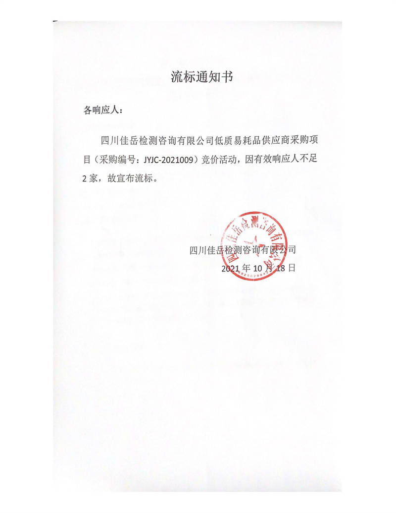 四川佳岳檢測咨詢有限公司低質易耗品供應商采購項目流標通知