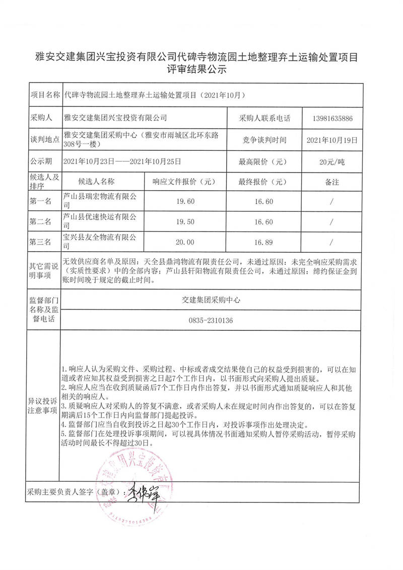 雅安交建集團(tuán)興寶投資有限公司代碑寺物流園土地整理?xiàng)壨吝\(yùn)輸處置項(xiàng)目評(píng)審結(jié)果公示