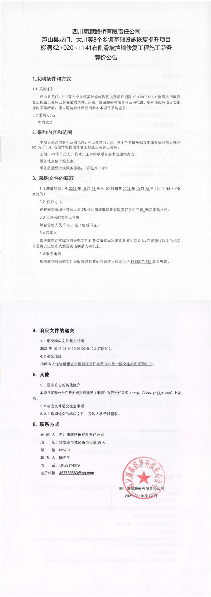 四川康藏路橋有限責(zé)任公司蘆山縣龍門(mén)、大川等8個(gè)鄉(xiāng)鎮(zhèn)基礎(chǔ)設(shè)施恢復(fù)提升項(xiàng)目棚洞K2+020~+141右側(cè)滑坡?lián)鯄π迯?fù)工程施工勞務(wù)采購(gòu)競(jìng)價(jià)公告