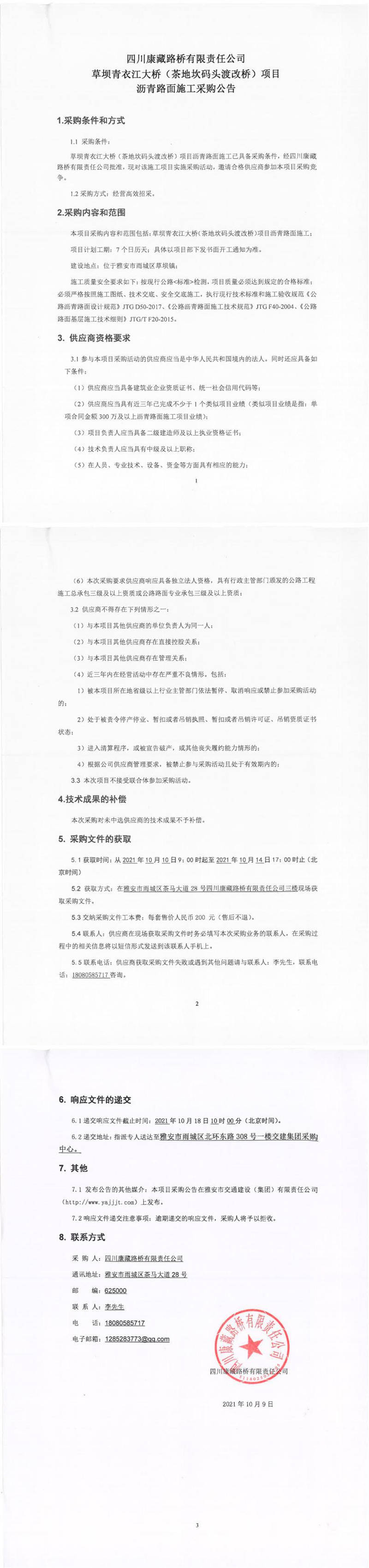 四川康藏路橋有限責任公司草壩青衣江大橋(茶地坎碼頭渡改橋)項目瀝青路面施工采購公告