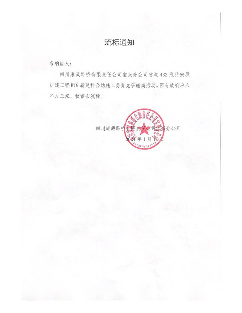 四川康藏路橋有限責(zé)任公司寶興分公司省道432線雅安段擴建工程K19新建拌合站施工勞務(wù)競爭磋商流標通知