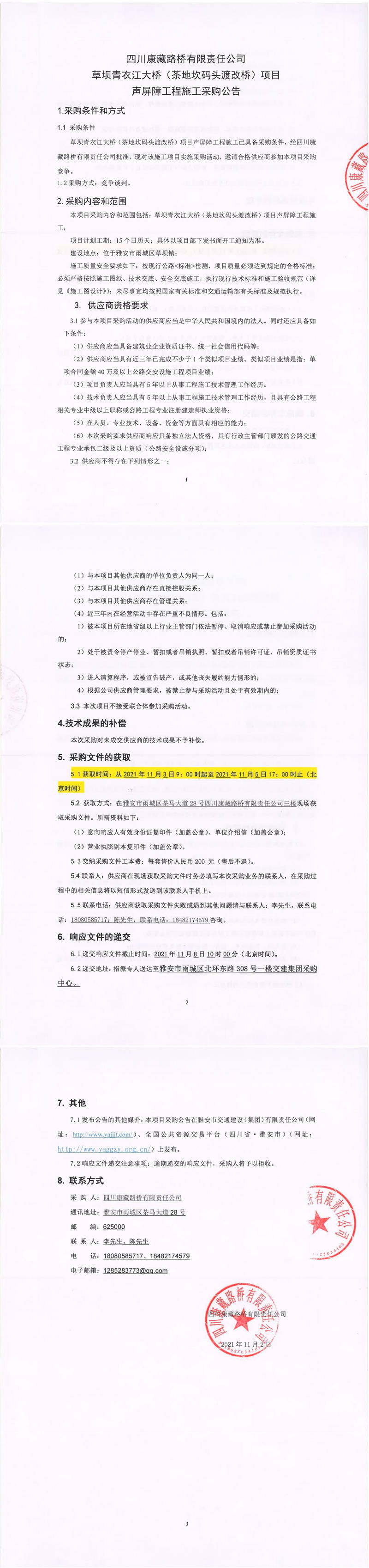 四川康藏路橋有限責(zé)任公司草壩青衣江大橋(茶地坎碼頭渡改橋)項(xiàng)目聲屏障工程施工競(jìng)爭(zhēng)談判采購(gòu)公告