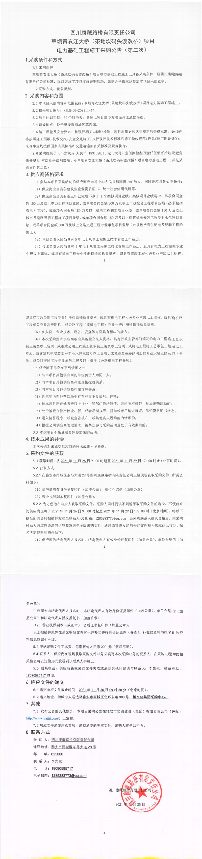 四川康藏路橋有限責(zé)任公司草壩青衣江大橋(茶地坎碼頭渡改橋)項(xiàng)目電力基礎(chǔ)工程施工采購(gòu)公告(第二次)
