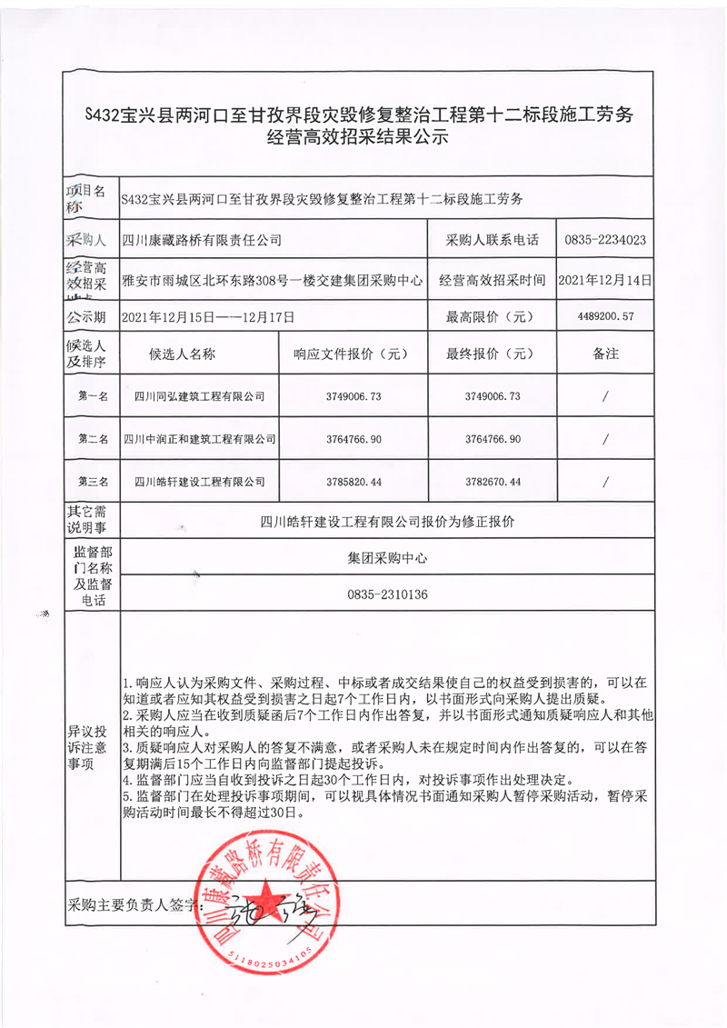 四川康藏路橋有限責任公司S432線寶興縣兩河口至甘孜界段災(zāi)毀修復(fù)整治工程第十二標段施工勞務(wù)經(jīng)營高效招采結(jié)果公示