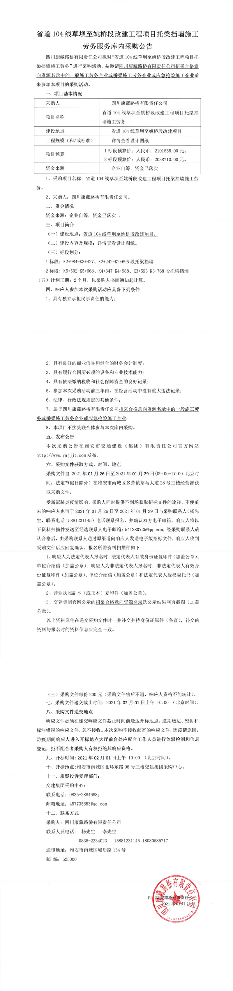 四川康藏路橋有限責(zé)任公司省道104線草壩至姚橋段改建工程項(xiàng)目托梁擋墻施工勞務(wù)服務(wù)庫(kù)內(nèi)采購(gòu)公告