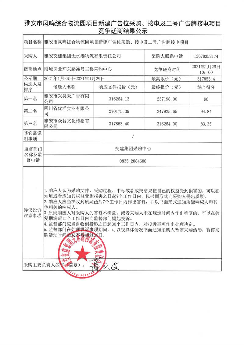 雅安交建集團(tuán)無(wú)水港物流有限責(zé)任公司雅安市鳳鳴綜合物流園項(xiàng)目新建廣告位采購(gòu)、接電及二號(hào)廣告牌接電項(xiàng)目競(jìng)爭(zhēng)磋商結(jié)果公示