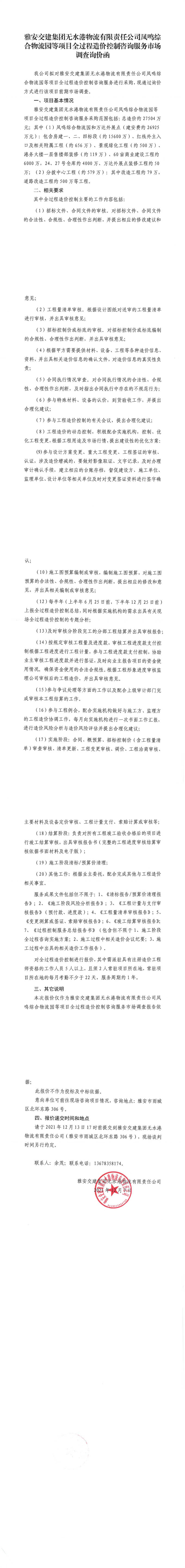 雅安交建集團(tuán)無水港物流有限責(zé)任公司鳳鳴綜合物流園等項(xiàng)目全過程造價(jià)控制咨詢服務(wù)市場調(diào)查詢價(jià)函