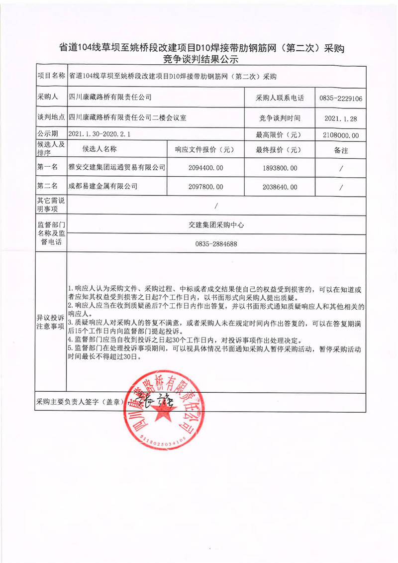 四川康藏路橋有限責(zé)任公司省道104線草壩至姚橋段改建項(xiàng)目D10焊接帶肋鋼筋網(wǎng)(第二次)采購(gòu)競(jìng)爭(zhēng)談判結(jié)果公示