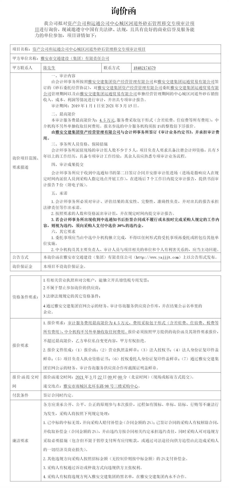 雅安市交通建設(集團)有限責任公司資產公司和運通公司中心城區(qū)河道外砂石管理移交專項審計項目詢價函