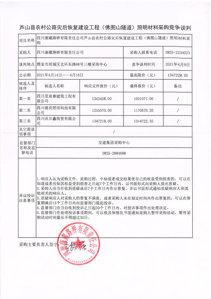 四川康藏路橋有限責(zé)任公司蘆山縣農(nóng)村公路災(zāi)后恢復(fù)建設(shè)工程(佛圖山隧道)照明材料采購競爭談判結(jié)果公示