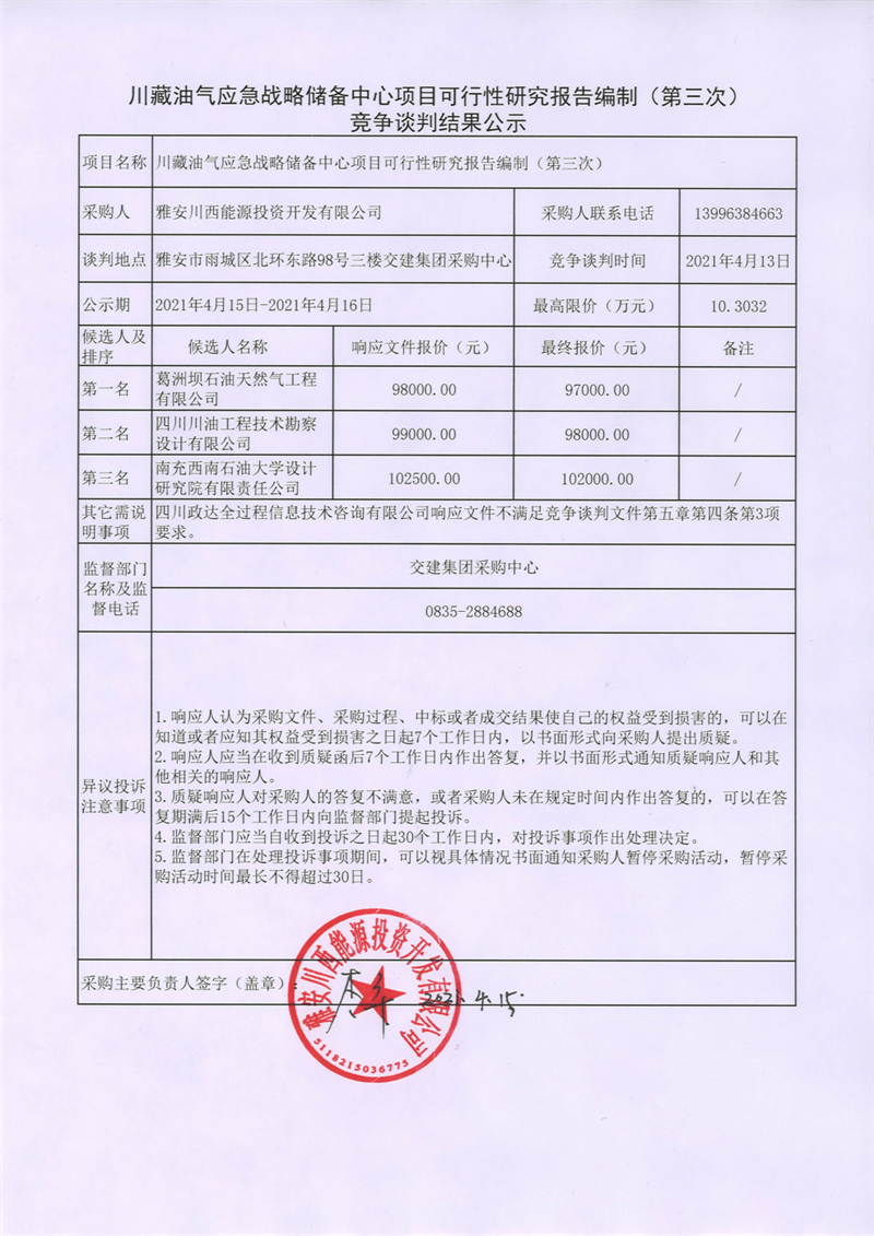 雅安川西能源投資開發(fā)有限公司川藏油氣應(yīng)急戰(zhàn)略儲(chǔ)備中心項(xiàng)目可行性研究報(bào)告編制 (第三次)競(jìng)爭(zhēng)談判結(jié)果公示