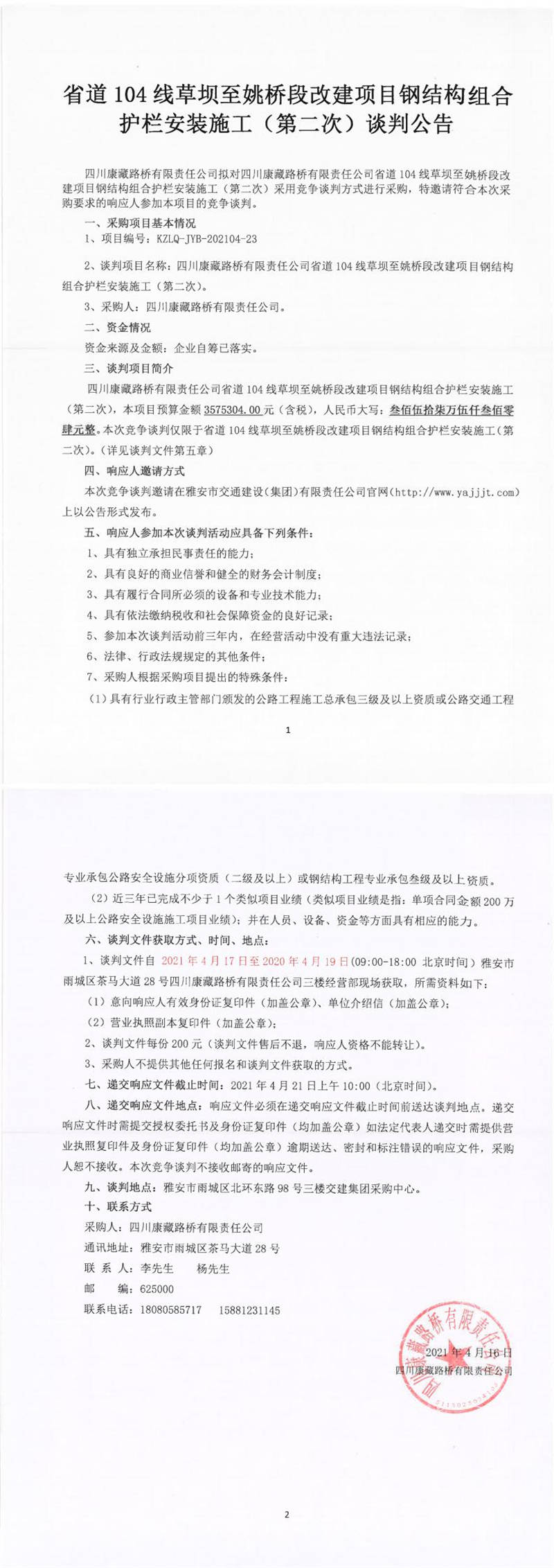 四川康藏路橋有限責(zé)任公司省道104線(xiàn)草壩至姚橋段改建項(xiàng)目鋼結(jié)構(gòu)組合護(hù)欄安裝施工(第二次)談判公告