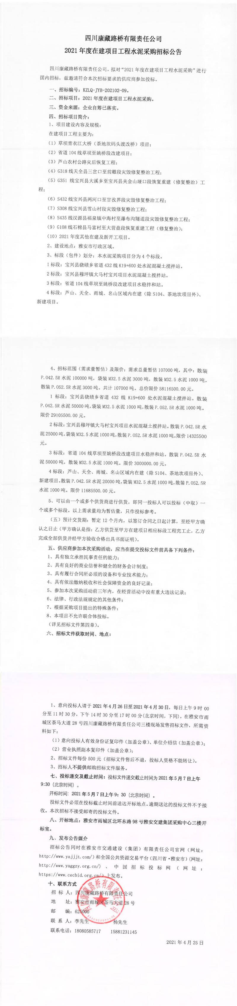 四川康藏路橋有限責(zé)任公司2021年度在建項目工程水泥采購招標(biāo)公告