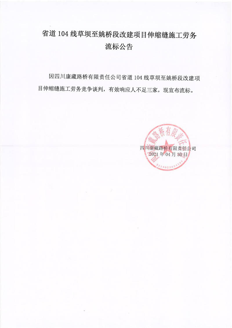 四川康藏路橋有限責(zé)任公司省道104線草壩至姚橋段改建項目伸縮縫施工勞務(wù)流標(biāo)公告