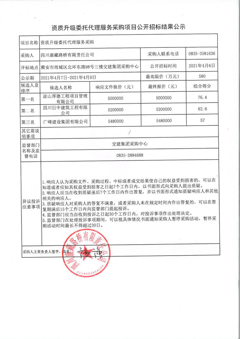 四川康藏路橋有限責(zé)任公司資質(zhì)升級(jí)委托代理服務(wù)采購(gòu)項(xiàng)目公開招標(biāo)結(jié)果公示