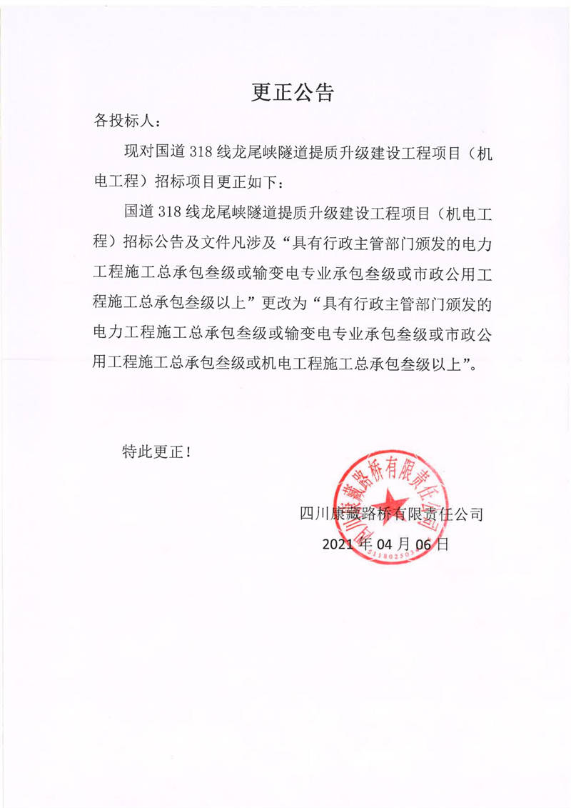 四川康藏路橋有限責任公司國道318線龍尾峽隧道提質(zhì)升級建設工程項目(機電工程)更正公告