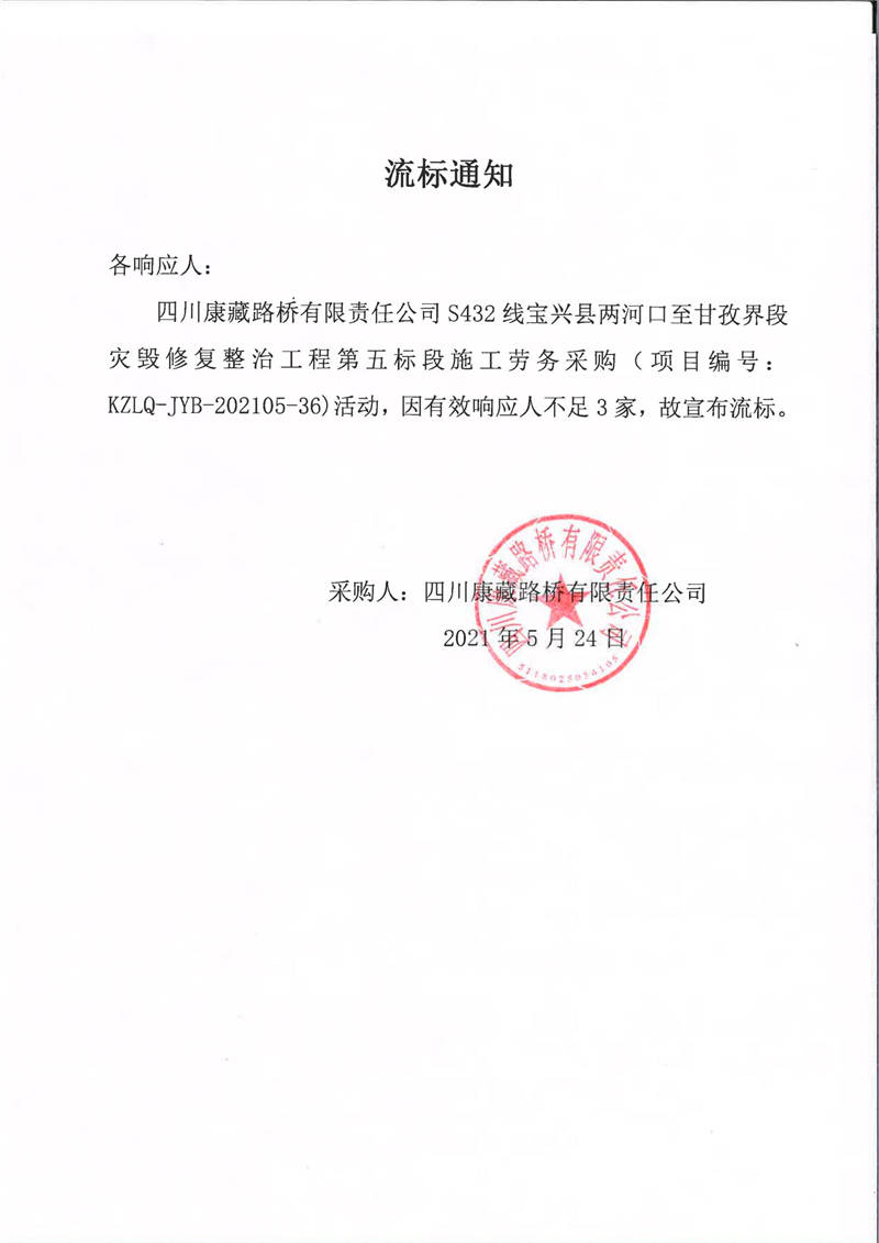 四川康藏路橋有限責任公司S432線寶興縣兩河口至甘孜界段災毀修復整治工程第五標段施工勞務采購流標通知