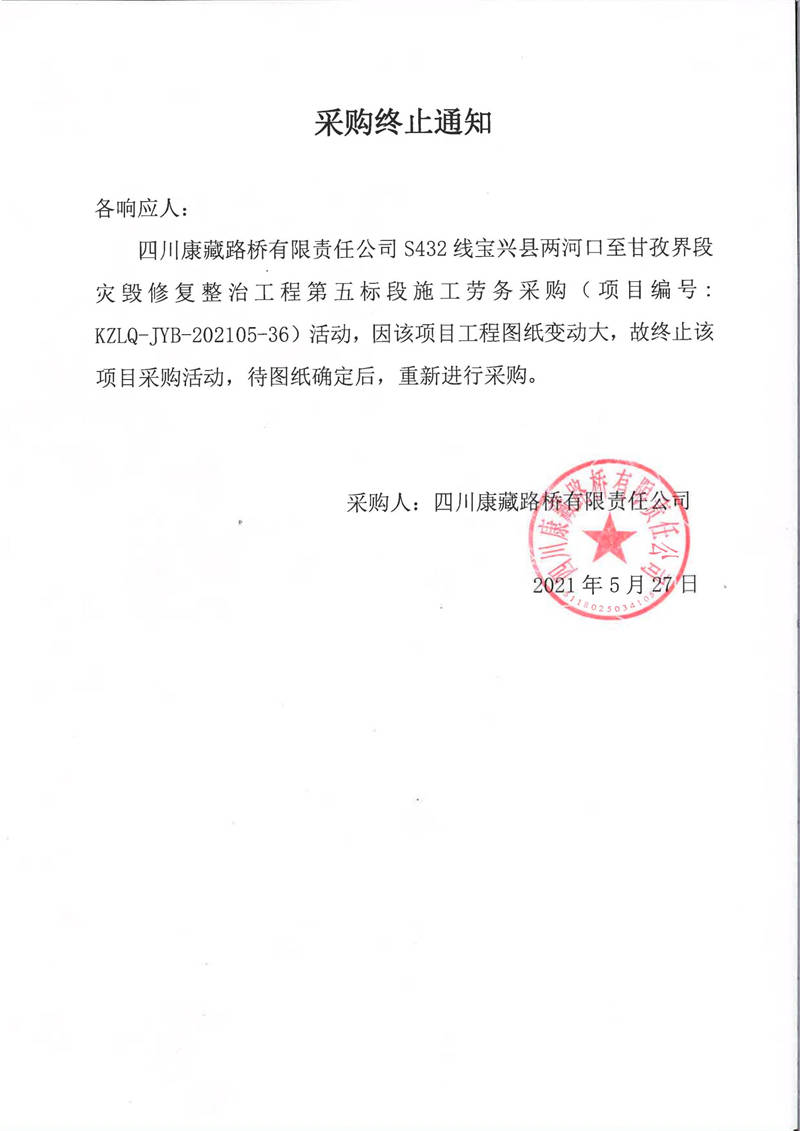 四川康藏路橋有限責任公司S432線寶興縣兩河口至甘孜界段災(zāi)毀修復(fù)整治工程第五標段施工勞務(wù)采購終止通知