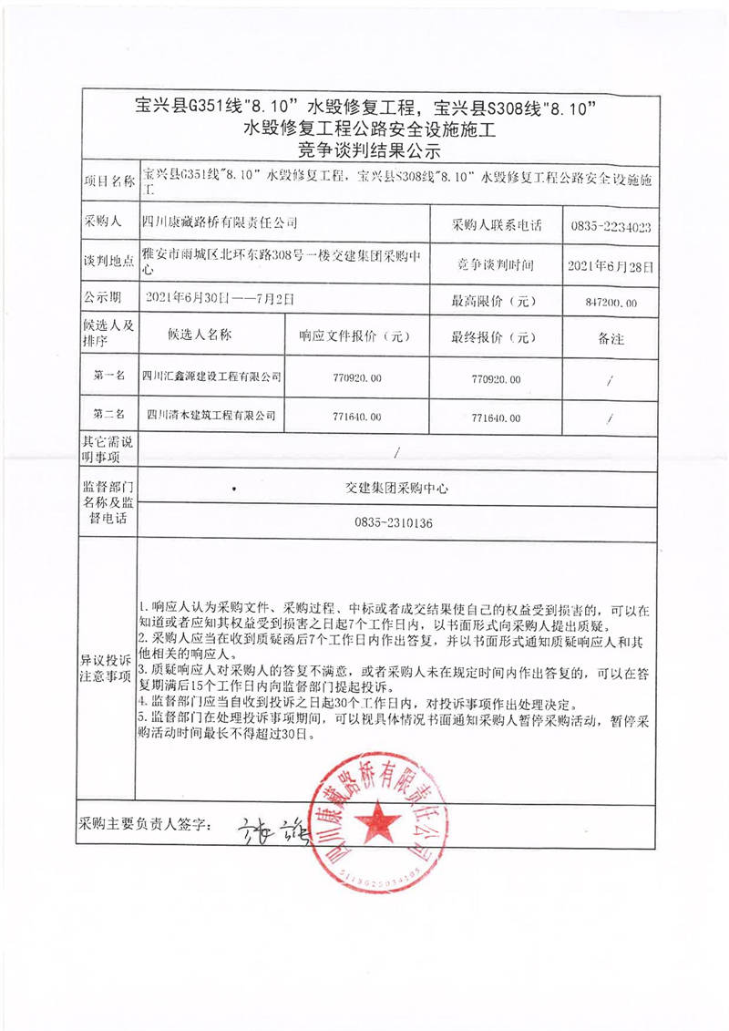 四川康藏路橋有限責任公司寶興縣G351線“8.10”水毀修復(fù)工程,寶興縣S308線水毀修復(fù)工程公路安全設(shè)施施工競爭談判結(jié)果公示