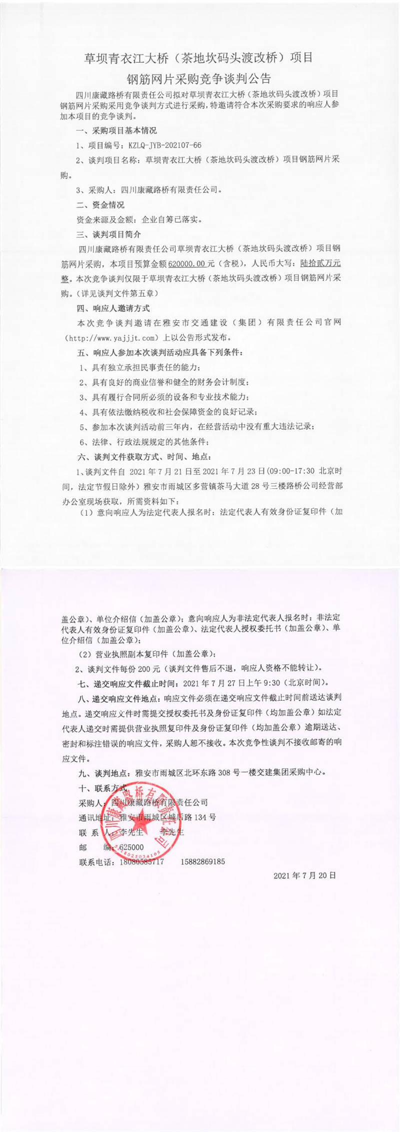 四川康藏路橋有限責任公司草壩青衣江大橋(茶地坎碼頭渡改橋)項目鋼筋網(wǎng)片采購競爭談判公告