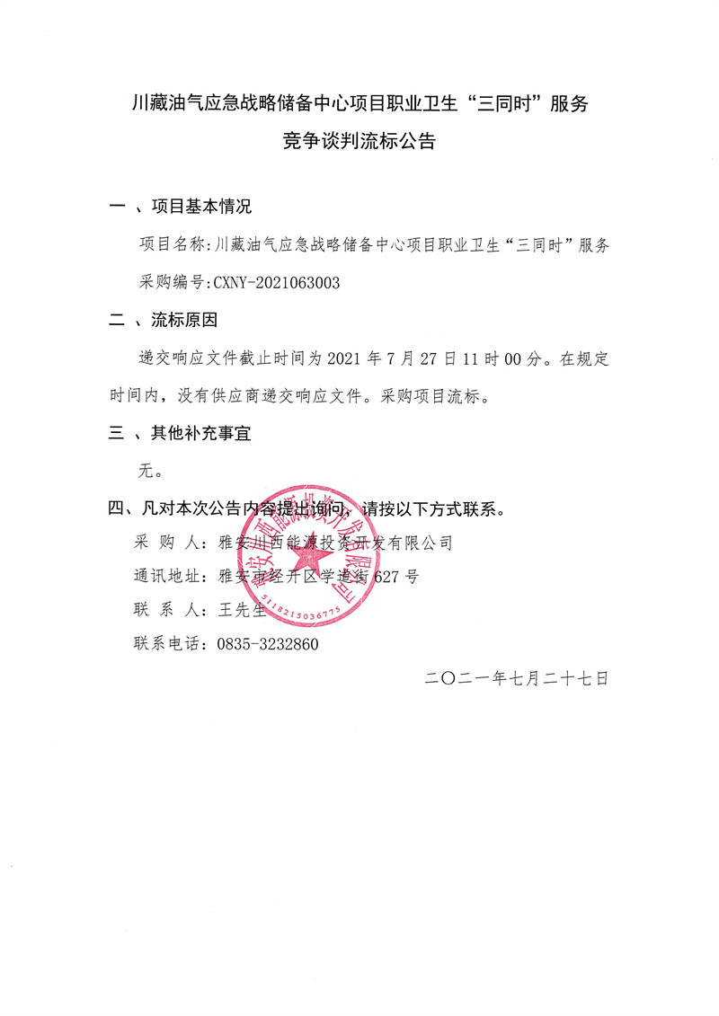 雅安川西能源投資開發(fā)有限公司川藏油氣應急戰(zhàn)略儲備中心項目職業(yè)衛(wèi)生“三同時”服務競爭談判流標公告