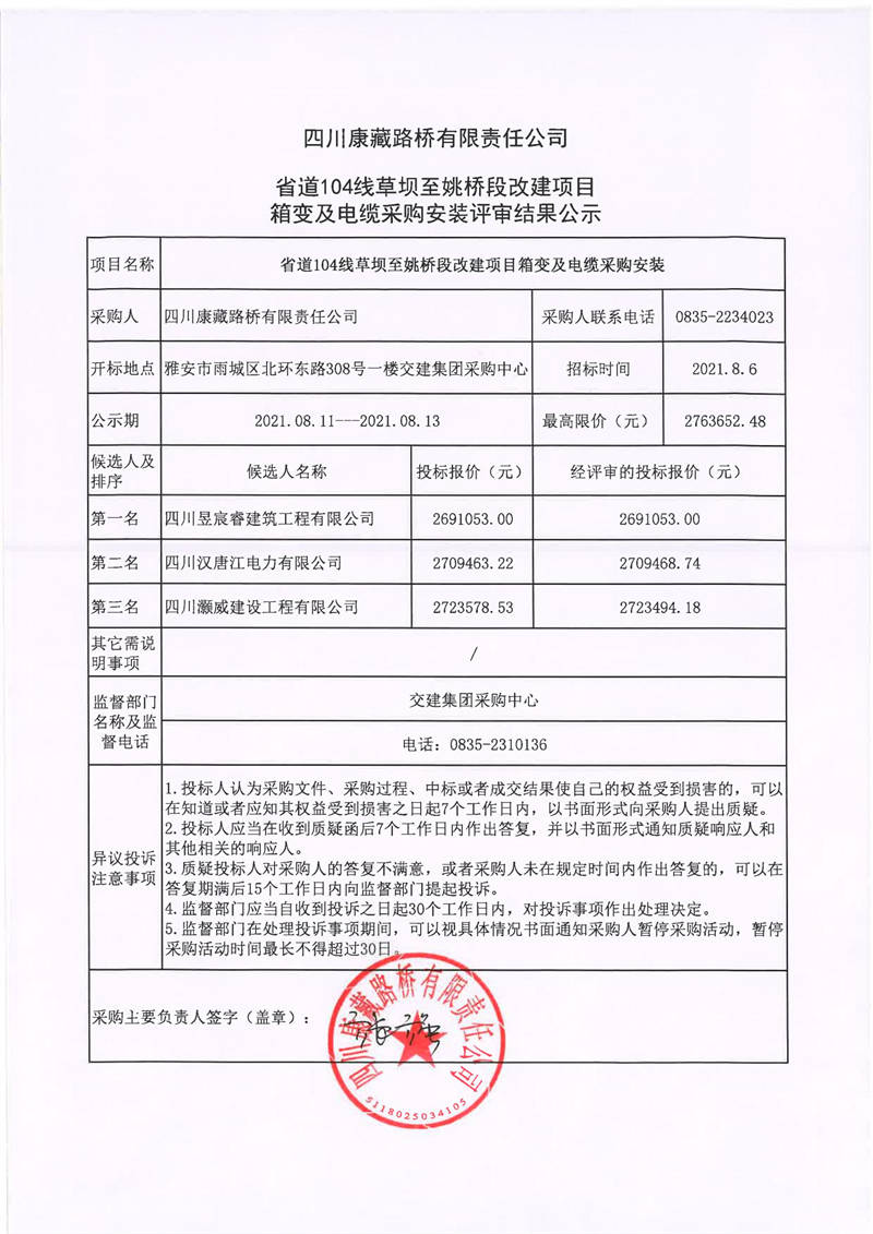 四川康藏路橋有限責任公司省道104線草壩至姚橋段改建項目箱變及電纜采購安裝評審結(jié)果公示