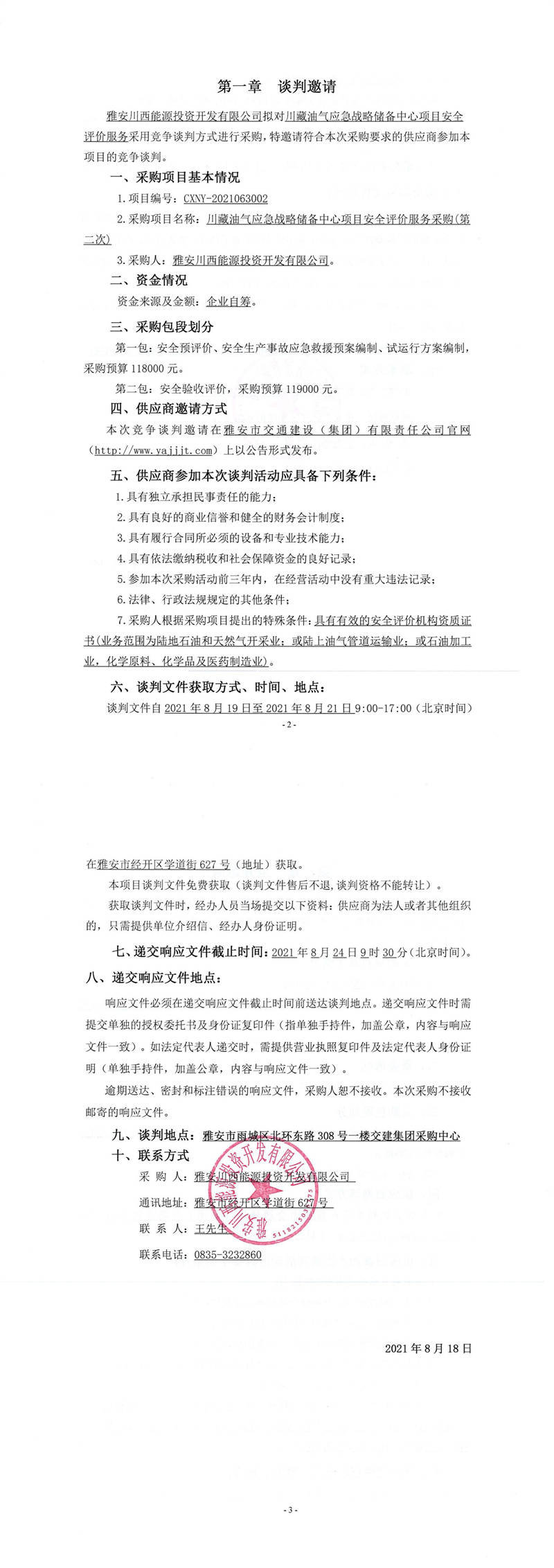 雅安川西能源投資開發(fā)有限公司川藏油氣應急戰(zhàn)略儲備中心項目安全評價服務(wù)采購(第二次)競爭談判公告