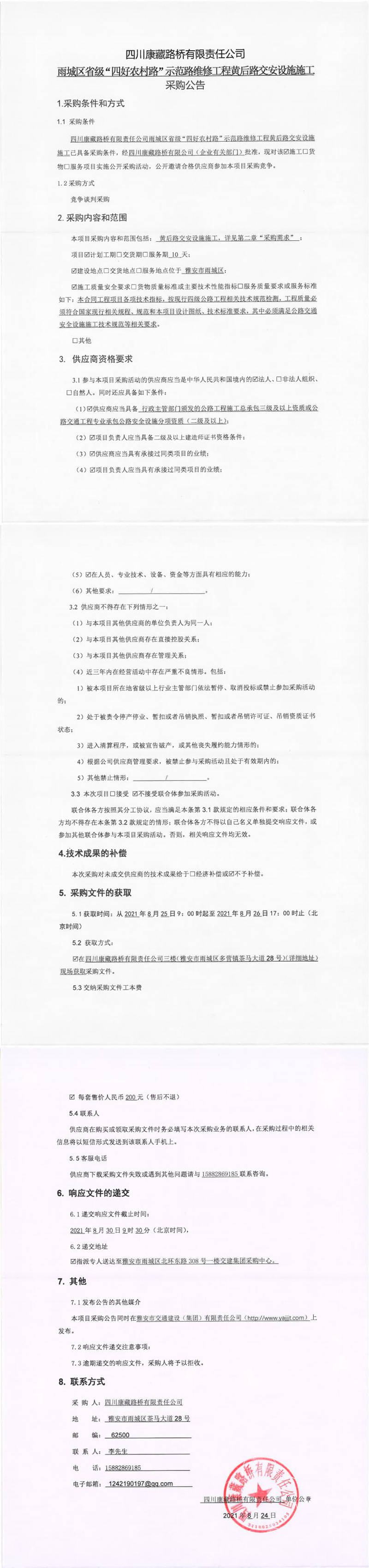 四川康藏路橋有限責(zé)任公司雨城區(qū)省級(jí)“四好農(nóng)村路”示范路維修工程黃后路交安設(shè)施施工采購公告