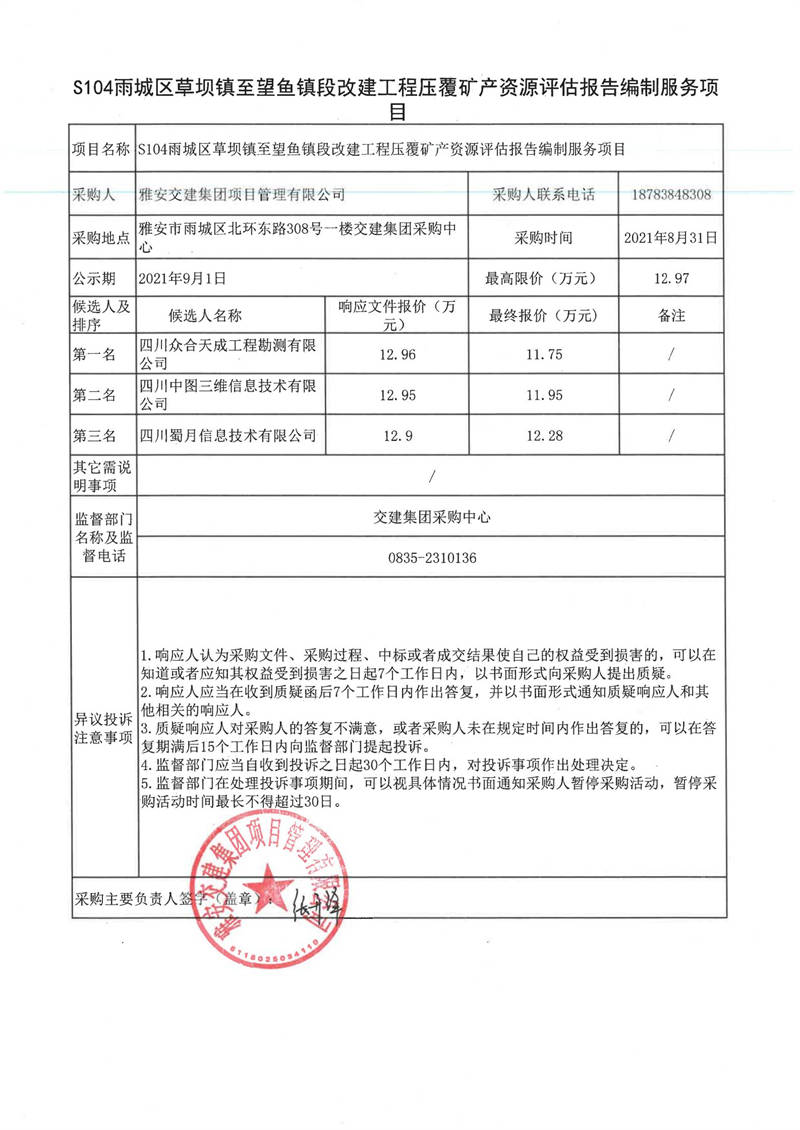 雅安交建集團項目管理有限公司S104雨城區(qū)草壩鎮(zhèn)至望魚鎮(zhèn)段改建工程壓覆礦產(chǎn)資源評估報告編制服務項目評審結(jié)果公示