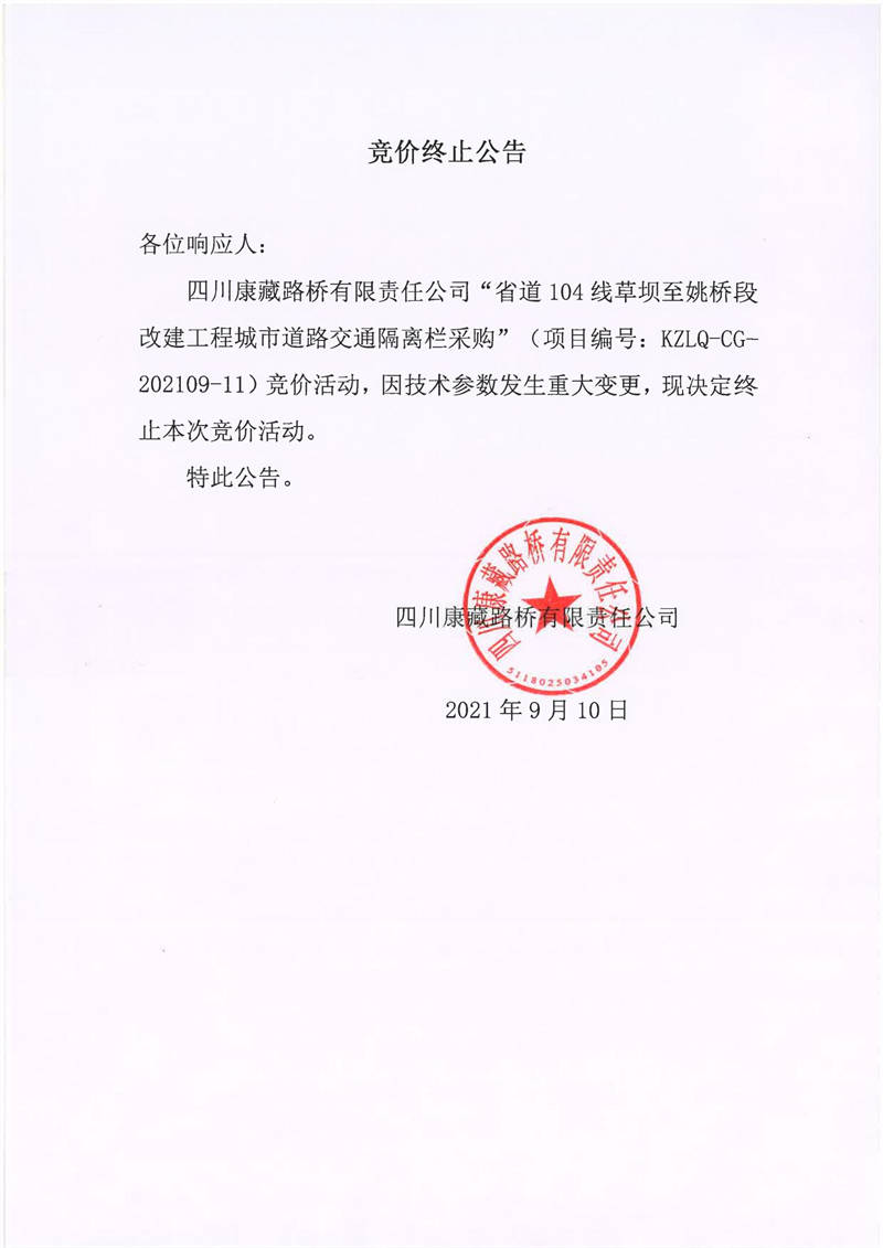 四川康藏路橋有限責(zé)任公司省道104線草壩至姚橋段改建工程城市道路交通隔離欄采購競價終止公告
