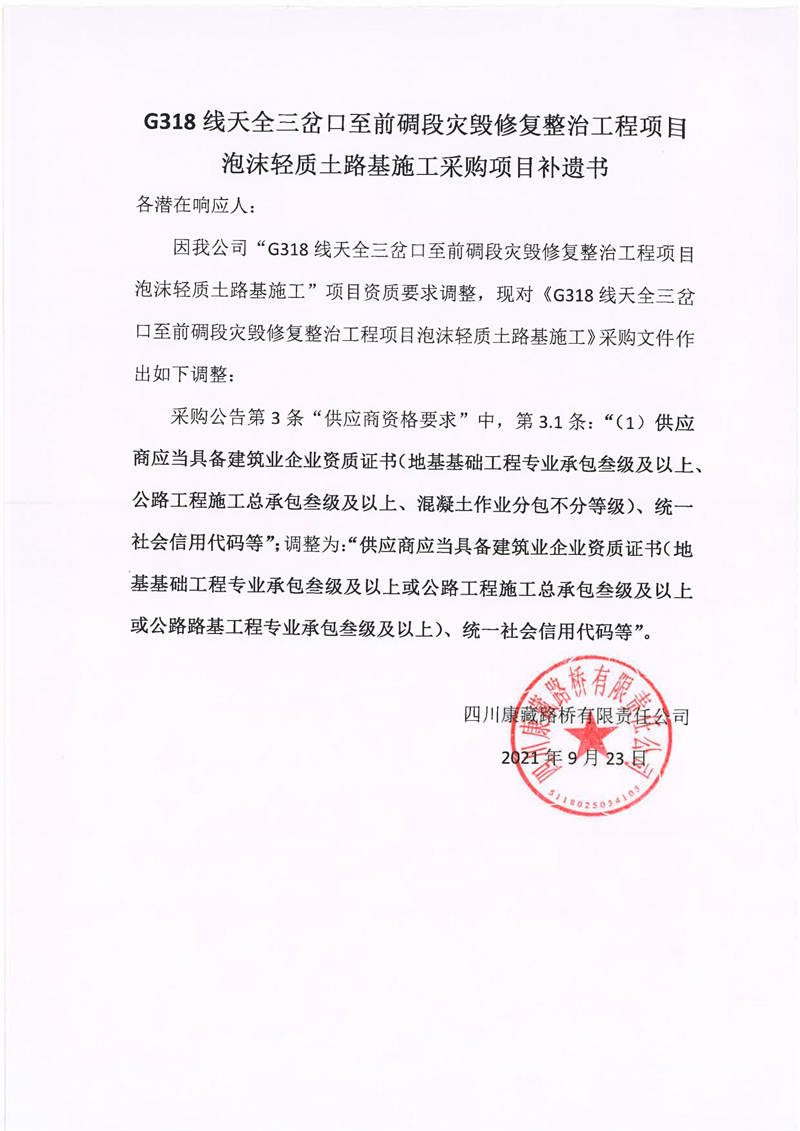 四川康藏路橋有限責任公司G318線天全三岔口至前碉段災毀修復整治工程項目泡沫輕質(zhì)土路基施工采購項目補遺書