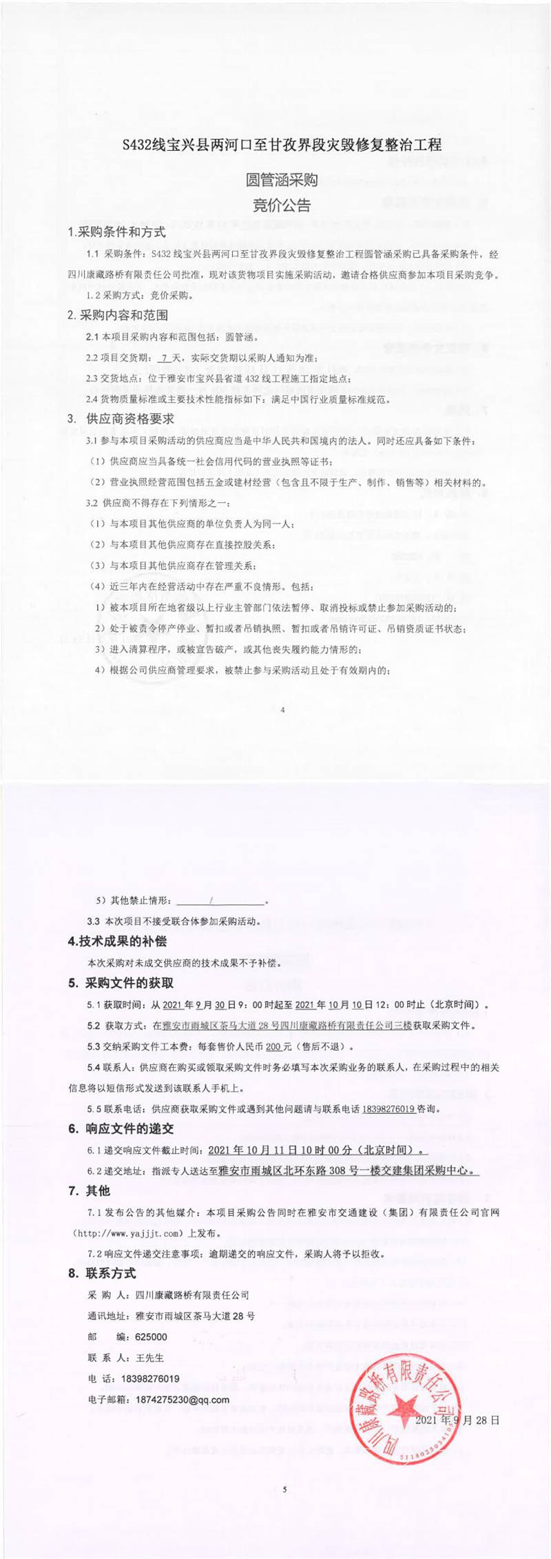 四川康藏路橋有限責任公司S432線寶興縣兩河口至甘孜界段災毀修復整治工程圓管涵采購競價公告