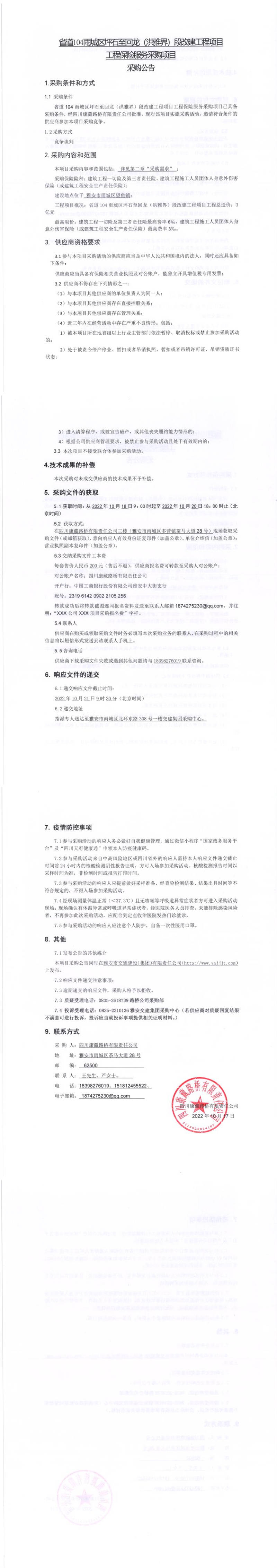 四川康藏路橋有限責任公司省道104雨城區(qū)坪石至回龍(洪雅界)段改建工程項目工程保險服務(wù)采購項目采購公告