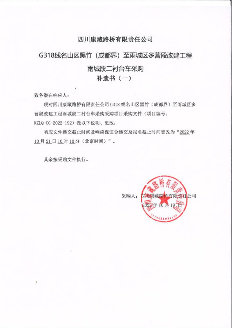 四川康藏路橋有限責任公司G318線名山區(qū)黑竹(成都界)至雨城區(qū)多營段改建工程雨城段二襯臺車采購補遺書(一)