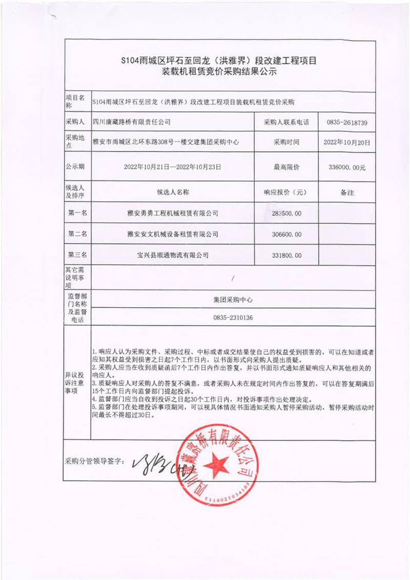 四川康藏路橋有限責(zé)任公司S104雨城區(qū)坪石至回龍(洪雅界)段改建工程項目裝載機租賃競價采購結(jié)果公示