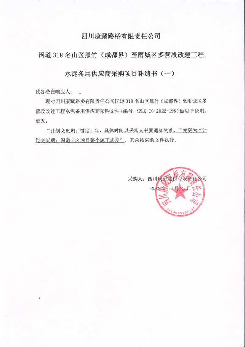 四川康藏路橋有限責(zé)任公司國(guó)道318名山區(qū)黑竹(成都界)至雨城區(qū)多營(yíng)段改建工程水泥備用供應(yīng)商采購(gòu)項(xiàng)目補(bǔ)遺書(一)