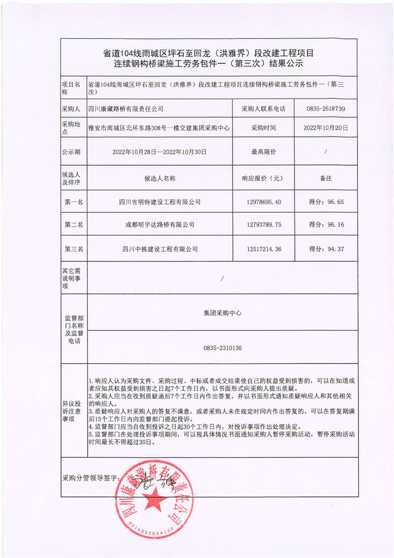 四川康藏路橋有限責(zé)任公司省道104線雨城區(qū)坪石至回龍(洪雅界)段改建工程項目連續(xù)鋼構(gòu)橋梁施工勞務(wù)包件一(第三次)結(jié)果公示