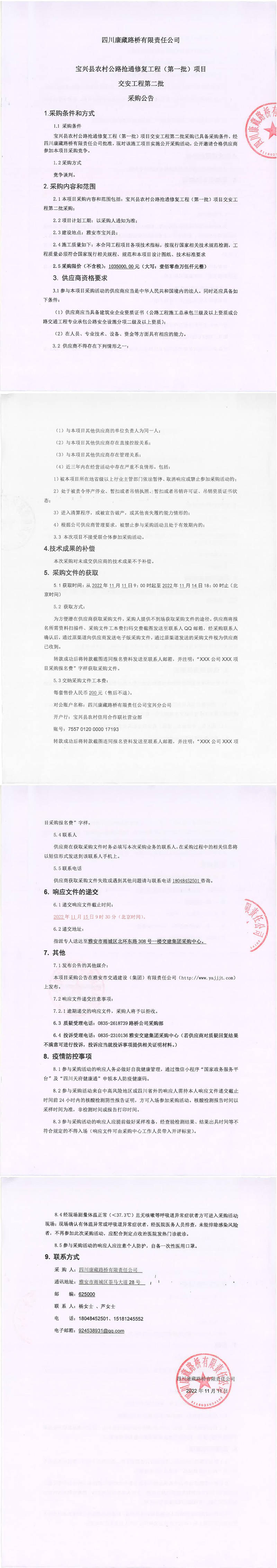 四川康藏路橋有限責(zé)任公司寶興縣農(nóng)村公路搶通修復(fù)工程(第一批)項目交安工程第二批采購公告