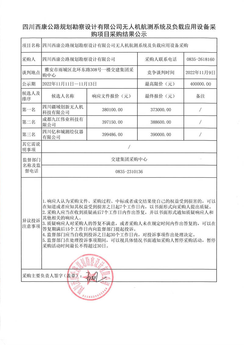 四川西康公路規(guī)劃勘察設(shè)計有限公司無人機航測系統(tǒng)及負載應(yīng)用設(shè)備采購項目采購結(jié)果公示