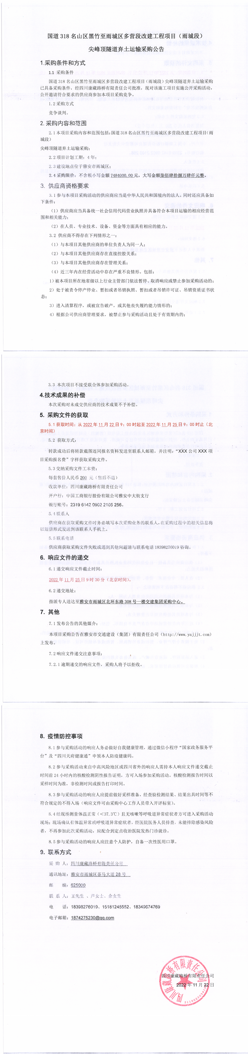 四川康藏路橋有限責(zé)任公司國(guó)道318名山區(qū)黑竹至雨城區(qū)多營(yíng)段改建工程項(xiàng)目(雨城段)尖峰頂隧道棄土運(yùn)輸采購(gòu)公告
